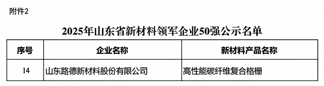 近日,山东省工业和信息化厅公示了2025年山东省新材料领军企业培育库入库企业及山东省新材料领军企业50强名单,协会常务理事单位青岛旭域土工材料股份有限公司、山东路德新材料股份有限公司、宏祥新材料股份有限公司;理事单位山东天海新材料工程有限公司、山东晶创新材料科技有限公司、天鼎丰控股有限公司(天鼎丰非织造布有限公司、天鼎丰聚丙烯材料技术有限公司);会员单位山东清田塑工有限公司、山东阳光新材料科技有限公司、泰安路德工程材料有限公司等多家单位入选。其中,山东路德新材料股份有限公司入选山东省新材料领军企业50强公示名单。