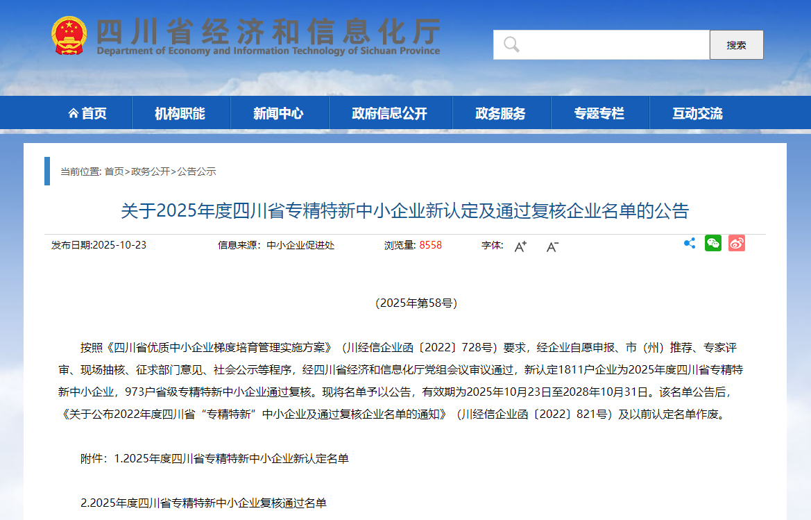 附件1-2:关于2025年度四川省专精特新中小企业新认定及通过复核企业名单的公告