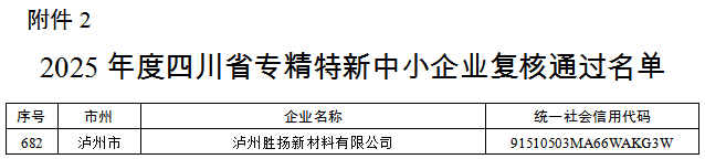 泸州胜扬新材料有限公司入选四川省专精特新中小企业复核通过名单