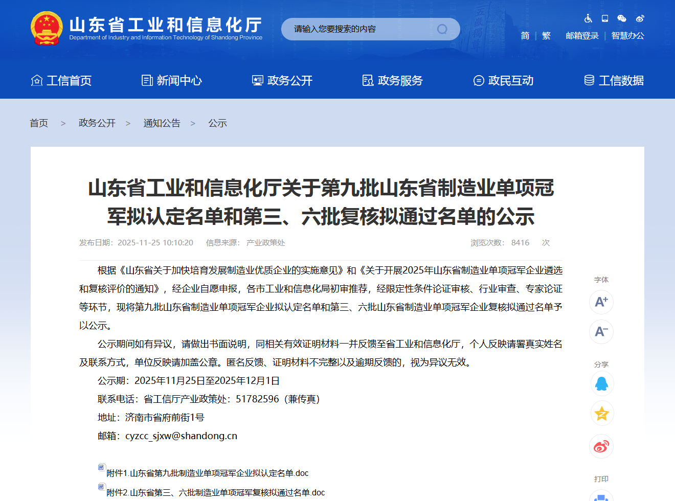 青岛旭域、潍坊驼王入选山东省第三、六批制造业单项冠军企业复核拟通过公示名单