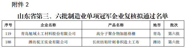 近日,山东省工信厅公示第三、六批制造业单项冠军企业复核拟通过名单,协会常务理事单位青岛旭域土工材料股份有限公司、理事单位潍坊驼王实业有限公司入选。