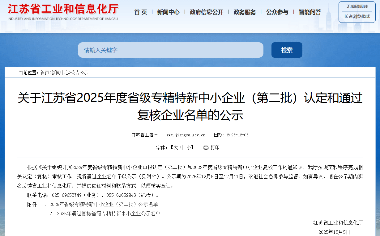 多家会员单位入选江苏2025年度省级专精特新中小企业(第二批)认定和通过复核企业公示名单
