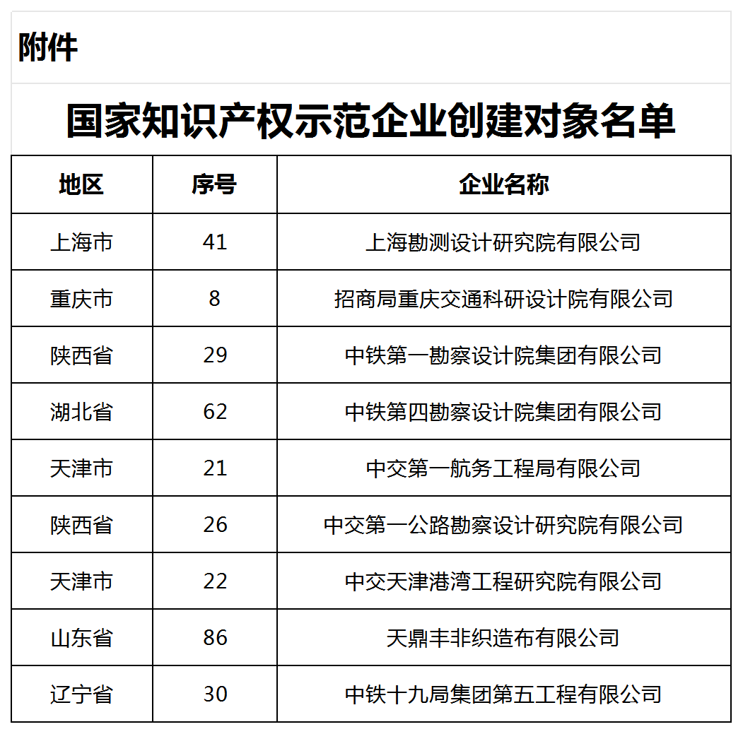 近日,国家知识产权局正式发布《关于确定2025—2027年国家知识产权强国建设示范创建对象的通知》,协会常务理事单位上海勘测设计研究院有限公司、招商局重庆交通科研设计院有限公司、中铁第一勘察设计院集团有限公司、中铁第四勘察设计院集团有限公司、中交第一航务工程局有限公司,理事单位中交第一公路勘察设计研究院有限公司、中交天津港湾工程研究院有限公司、天鼎丰非织造布有限公司,会员单位中铁十九局集团第五工程有限公司入选国家知识产权示范企业创建对象名单。