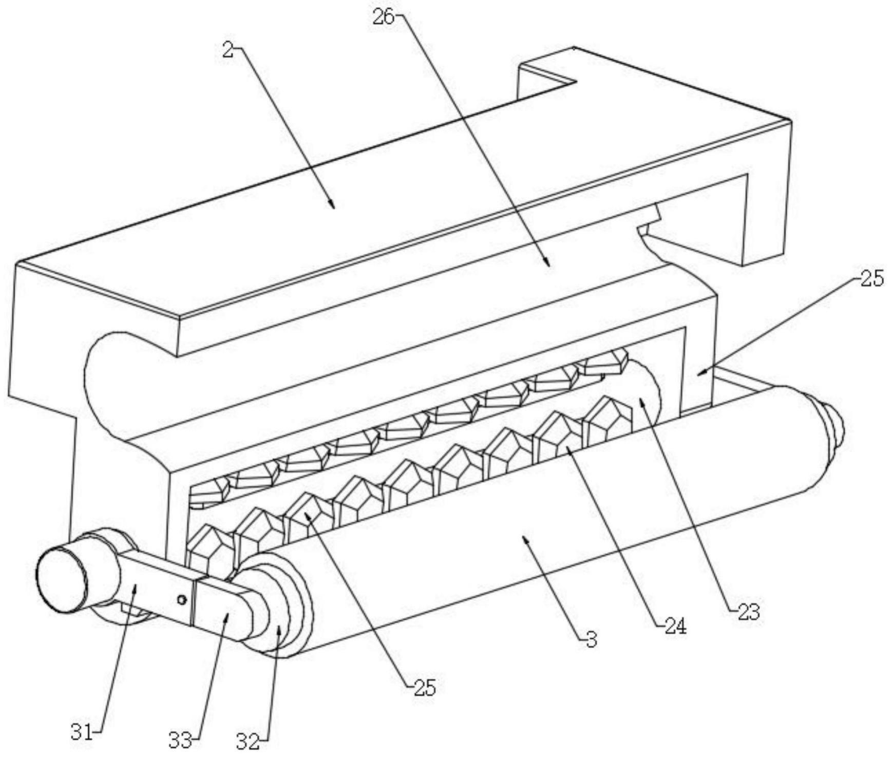 图2 图3 图4 图5 图6 图7 图8 图9 图10 图11 图12 图1为本发明的整体外观结构示意图; 图2为图1中的匀料部与设备主体分解部分结构示意图; 图3为图1中的匀料部与预压部连接部分结构示意图; 图4为图1中的六边块与六边土工格室连接部分结构示意图; 图5为图1中的连架板与预压部分解部分结构示意图; 图6为图1中的滑架与拉伸部连接部分结构示意图; 图7为图1中的拉伸部内部部分结构示意图; 图8为图1中的限位部内部部分结构示意图; 图9为图8中的A部分局部放大结构示意图; 图10为图7中的保持架内部部分结构示意图; 图11为图10中的B部分局部放大结构示意图; 图12为图2中的调位部内部部分结构示意图; 附图中,各标号所代表的部件列表如下: 图中:1、设备主体;2、匀料部;3、预压部;4、拉伸部;5、伸缩部;6、 限位部;7、调位部; 11、隔板;12、滚套;13、收纳区;14、限位滑座;15、六边土工格室; 21、侧槽;22、电动滑座;23、旋转轴;24、六边块;25、侧座;26、收纳 槽;27、凸块; 31、电动旋转座;32、旋转套;33、连架板;34、凸板;35、旋转块;36、 阶梯孔; 41、第一拉绳;42、第二拉绳;43、滑架;44、夹板;45、凸管;46、支 杆;47、滑套;48、保持架;49、固定架; 411、第一锥形管;412、第二锥形管;413、凸环;414、凸轴; 423、板套;481、电动轮;482、凸齿;491、支板; 51、螺旋套管;52、电动螺杆;53、侧管;54、伸缩导杆; 61、电动冲压部;62、销杆;63、顶板;64、斜锥坡;65、伸缩套管; 71、挡板;72、滑道;73、电动推拉杆;74、滑板。