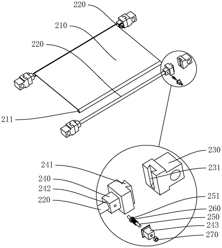 图例说明: 图2 主视剖面示意图 图3 第一卡接板和第二卡接板之间的安装示意图 1、复合膜本体;2、第一土工布层;3、走水槽;4、防渗透层;5、土工膜层;6、加强条;7、缓冲层;8、缓冲簧;9、支撑加强层;10、第二土工布层;11、摩擦条;12、第一固定板;13、第一卡接板;14、第二固定板;15、第二卡接板。 2 实用新型名称:一种单面糙面土工膜吹膜喷糙一体机组 申请号:CN202222127351 公开号:CN218876261U 授权公告日:2023.04.18 专利权人:山东莱芜新甫冠龙塑料机械有限公司 本实用新型涉及土工膜加工技术领域,尤其涉及一种单面糙面土工膜吹膜喷糙一体机组。其包括底板,所述底板上设有吹膜机,所述吹膜机的一侧设有导向机构,所述导向机构的一侧设有箱体,所述箱体内安装有导向辊,所述箱体的一侧开设有进口,所述进口内设有限制辊,所述箱体的另一侧设有出口,所述出口的底部设有支撑辊,所述出口的顶部设有电动推杆,所述电动推杆的伸长端固定连接有安装板,所述安装板底部设有连接板,所述连接板上设有压辊,所述箱体的内腔顶部安装有分流管一,所述分流管一的底部连接有多个喷料管,所述箱体的内腔顶部还设有空气预热器。本实用新型能够加快物料的喷出速度,防止物料粘结,提高了喷糙效果。