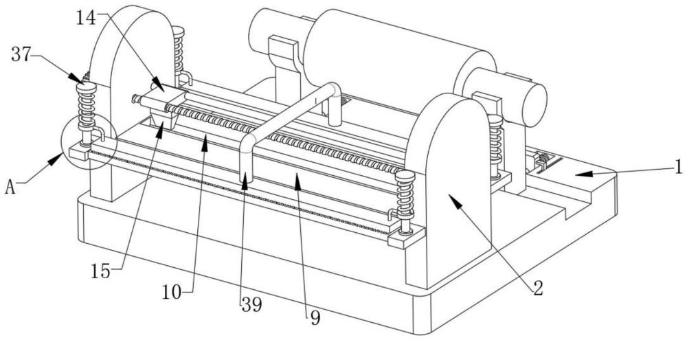 图例说明: 图2 右视结构示意图 图3 左视结构示意图 图4 图1中A处的结构示意图 图5 图3中B处的结构示意图 1、底座;2、支架板;3、压紧装置;31、支撑板;32、下夹板;33、滑杆;34、滑环;35、连接杆;36、上夹板;37、限位板;38、第一弹簧;39、拉杆;4、滑槽;5、U型撑架;6、辊筒;7、土工膜本体;8、固定装置;81、凹槽;82、第二弹簧;83、滑块;84、插杆;85、插孔;86、条形槽;87、位移板;9、横板;10、切割槽;11、螺纹杆;12、电机;13、横杆;14、移动座;15、切割刀。