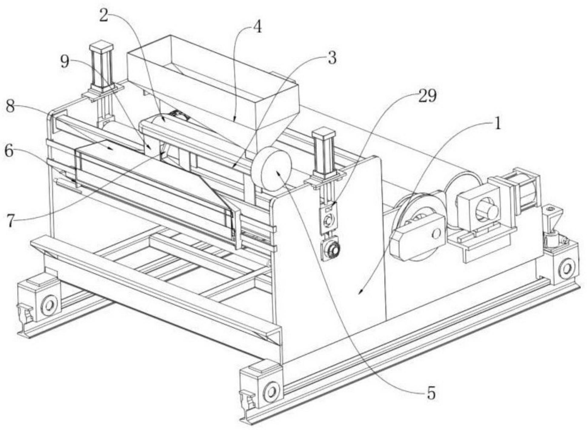 图2 图3 图4 图5 图6 图7 图8 图9 图10 图1 本发明实施例输送土工膜状态下的结构示意图。 图2 本发明实施例中铺设架的结构示意图。 图3 本发明实施例中内撑机构的结构示意图。 图4 本发明实施例中内撑机构的内部结构示意图。 图5 本发明实施例中内撑机构和土工膜的结构示意图。 图6 发明实施例输送土工膜状态下的结构示意图。 图7 发明实施例铺设土工膜状态下的结构示意图。 图8 为图7中A部的局部放大图。 图9 发明实施例铺设土工膜状态下的结构示意图。 图10 本发明实施例中插板和限位筒的内部结构示意图。 图例说明: 1、铺设架;2、土工膜;3、内撑机构;301、插杆;302、螺杆;303、滚柱;304、限位挡板;305、推块;306、环形推板;307、调节螺母;308、弧形撑板;309、第一连杆;310、第二连杆;311、第 三连杆;312、第一固定块;313、第二固定块;4、车轮;5、左侧板;6、右 侧板;7、外套杆;8、内撑杆;9、紧固螺栓;10、第二限位套筒;11、第二 弧形撑杆;12、第一限位套筒;13、第一弧形撑杆;14、U形限位槽;15、插 槽;16、插孔;17、推拉扶手;18、限位筒;1801、环形挡板;19、插板;20、竖杆;2001、限位顶板;21、牛眼轮;22、限位插杆;23、弹簧;24、 土工膜底撑组件。 3.发明专利名称:一种复合土工膜生产用成型装置 申请号:CN202311805839.8 公开号:CN117464949B 授权公告日:2024.03.19 专利权人:山东天仁新材料有限公司 本发明提供一种复合土工膜生产用成型装置,涉及塑料膜成型技术领域。该基于复合土工膜生产用成型装置,包括主机架,所述主机架为两侧龙门支架结构,所述主机架侧壁一侧固定连接有螺旋挤压机,所述螺旋挤压机侧壁固定连接有U型导热套,所述U型导热套为U型风管结构同时具有两个同侧方向的管口。通过一级和二级压薄组件同时运作保障作业的一致性,液压输出组件根据成膜厚度的要求进行调节,保障成膜的厚度符合预定要求,通过调整流道结构和压薄组件的运动,实现对原料流动的动力学控制,确保挤压成膜过程的平稳进行,加速成膜的速率,配合链轮输出组件、导辊、配合辊、压合辊、细辊系统,实现成膜的输送和最终的输出收卷。