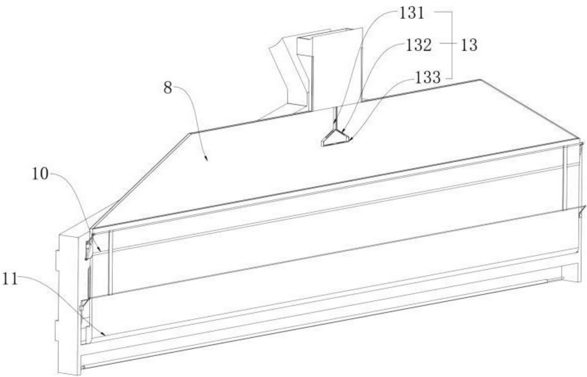 图2 图3 图4 图5 图6 图7 图8 图9 图10 图11 图12 图13 图14 图1为本发明的整体结构立体示意图; 图2为本发明的整体结构侧视立体示意图一; 图3为本发明的整体结构侧视立体示意图二; 图4为本发明的成膜结构立体示意图; 图5为本发明的成膜结构俯视立体示意图; 图6为本发明的输气斗以及成膜箱结构组合立体示意图; 图7为本发明的输气斗以及成膜箱结构组合侧视示意图; 图8为本发明的输气斗以及成膜箱结构组合剖视示意图一; 图9为本发明的输气斗内部结构示意图; 图10为本发明的成膜箱结构立体示意图; 图11为本发明的成膜箱内部结构示意图; 图12为本发明的成膜箱内部结构剖视示意图; 图13为本发明的一级压薄组件结构立体示意图; 图14为本发明的二级压薄组件立体示意图。 图例说明: 1、主机架;2、螺旋挤压机;3、U型导热套;4、入料斗;5、鼓风机;6、成膜箱;7、入料道;8、输气斗;9、入气道;10、热气输送组件;101、热气输送道;102、热气输送弯道;11、换热输送组件;111、冷气转换 道;112、冷气输送弯道;113、导热管;12、加热条;13、散气组件;131、 引导杆;132、锥形喷溅块;133、输入槽口;14、外侧分隔道;15、内侧分 隔道;16、转动座一;17、一级压薄组件;171、旋转板一;172、弧形封闭 板;173、压合斜板;18、撬杆一;19、固定框;20、联动杆一;21、转动座 二;22、撬杆二;23、联动杆二;24、传动杆;25、二级压薄组件;251、旋 转板二;252、弧形板;253、压膜板;26、液压输出组件;27、顶升道;28、输出导辊;29、滑动架;30、压合辊;31、齿轮传动组件;311、副齿轮;312、主齿轮;32、引导细辊;33、驱动粗辊;34、配合辊;35、链轮输 出组件;36、引导粗辊;37、输出细辊。