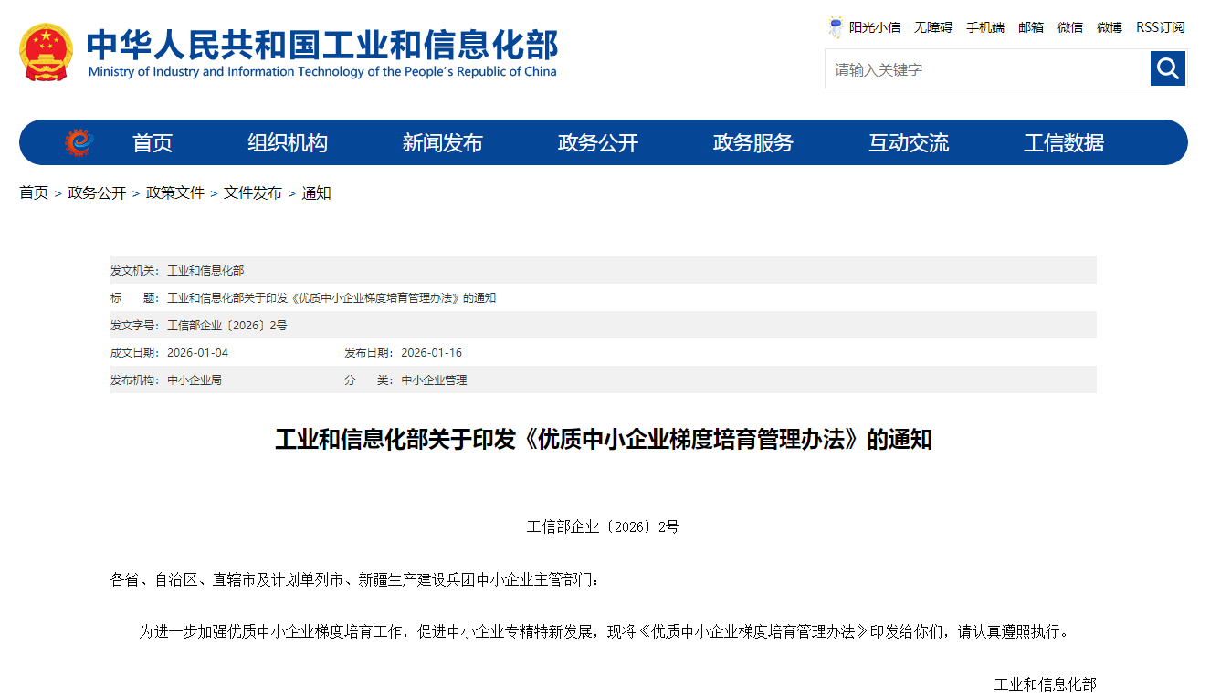 | 近日,工业和信息化部印发最新修订的《优质中小企业梯度培育管理办法》。《办法》包含总则、认定程序和认定标准、动态管理、培育服务、附则五章,以及专精特新中小企业认定标准、专精特新“小巨人”企业认定标准、部分指标和要求说明3个附件。 《办法》扩大了培育基础,首次将科技型中小企业纳入梯度培育范围,未来的优质中小企业梯度将包含科技和创新型中小企业、专精特新中小企业和专精特新“小巨人”企业;并在动态管理、培育服务等方面作出更进一步要求,确保培育企业质量。同时,对专精特新中小企业认定标准、专精特新“小巨人”企业认定标准进行完善。 附件: