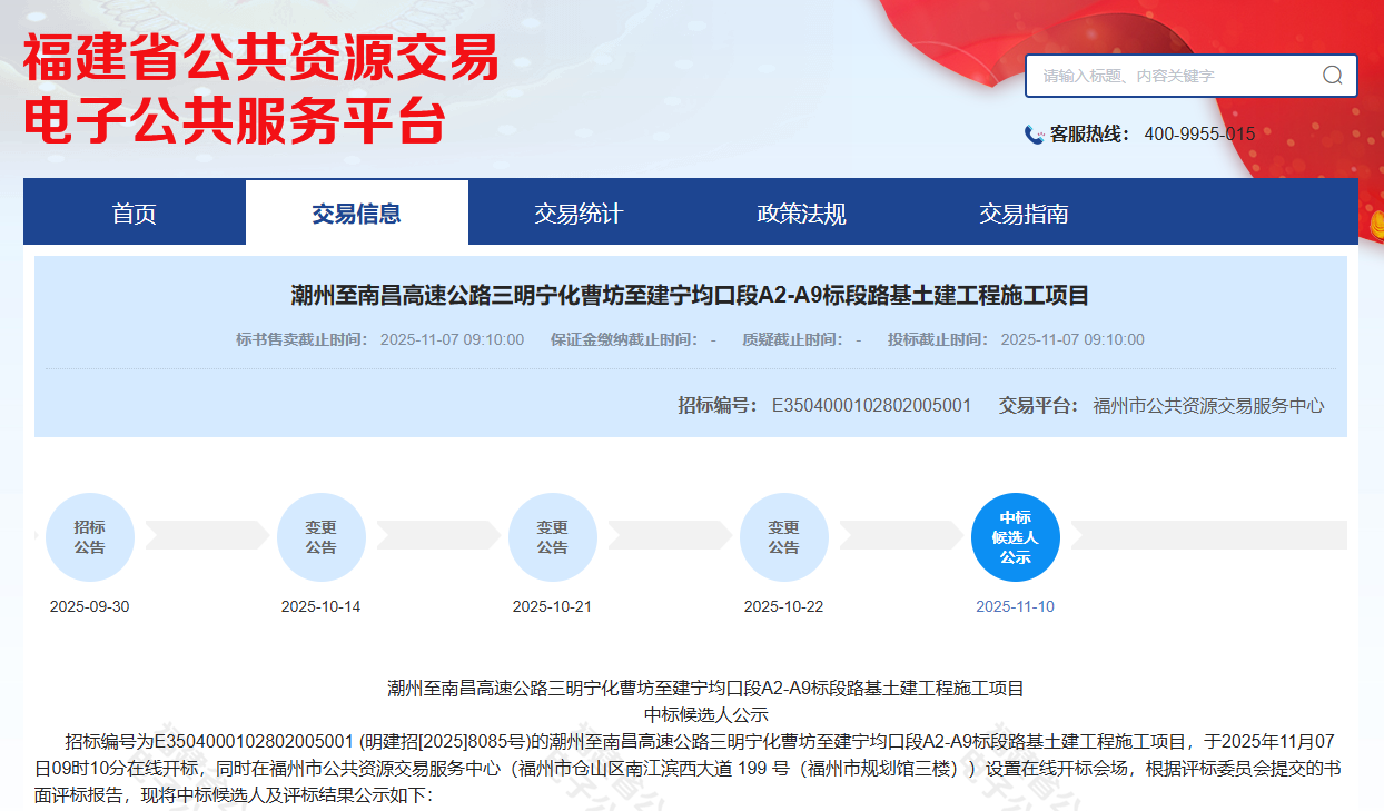 导语:近日,从福建省公共资源交易电子公共服务平台获悉,潮州至南昌高速公路三明段(宁化曹坊至建宁均口)工程建设取得关键进展:项目A2至A9共八个路基土建标段的中标结果已集中公示,标志着该项目即将进入全面施工阶段。