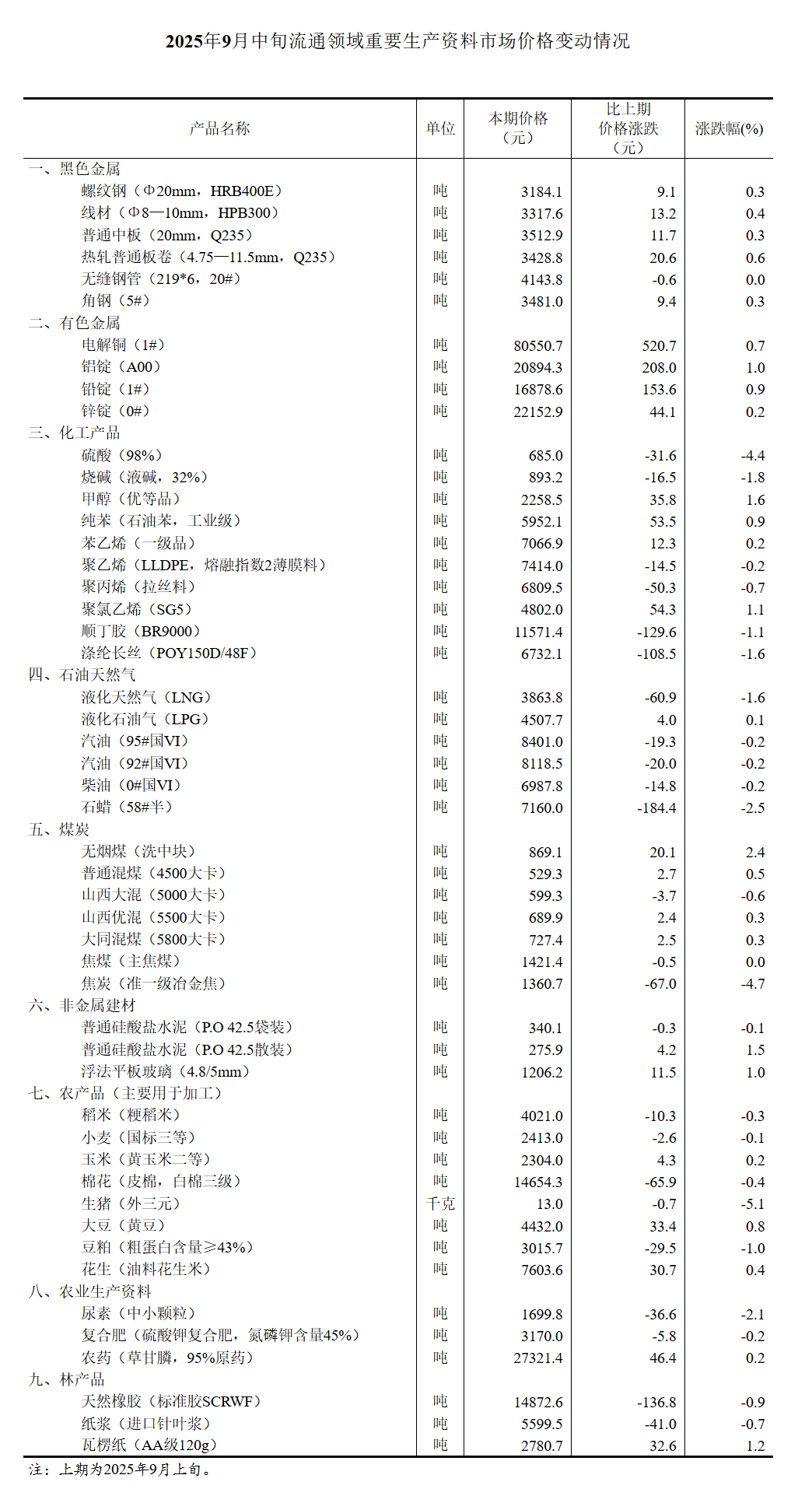 2025年9月下旬流通领域重要生产资料市场价格变动情况 据对全国流通领域9大类50种重要生产资料市场价格的监测显示,2025年9月下旬与9月中旬相比,15种产品价格上涨,31种下降,4种持平。 ![]()