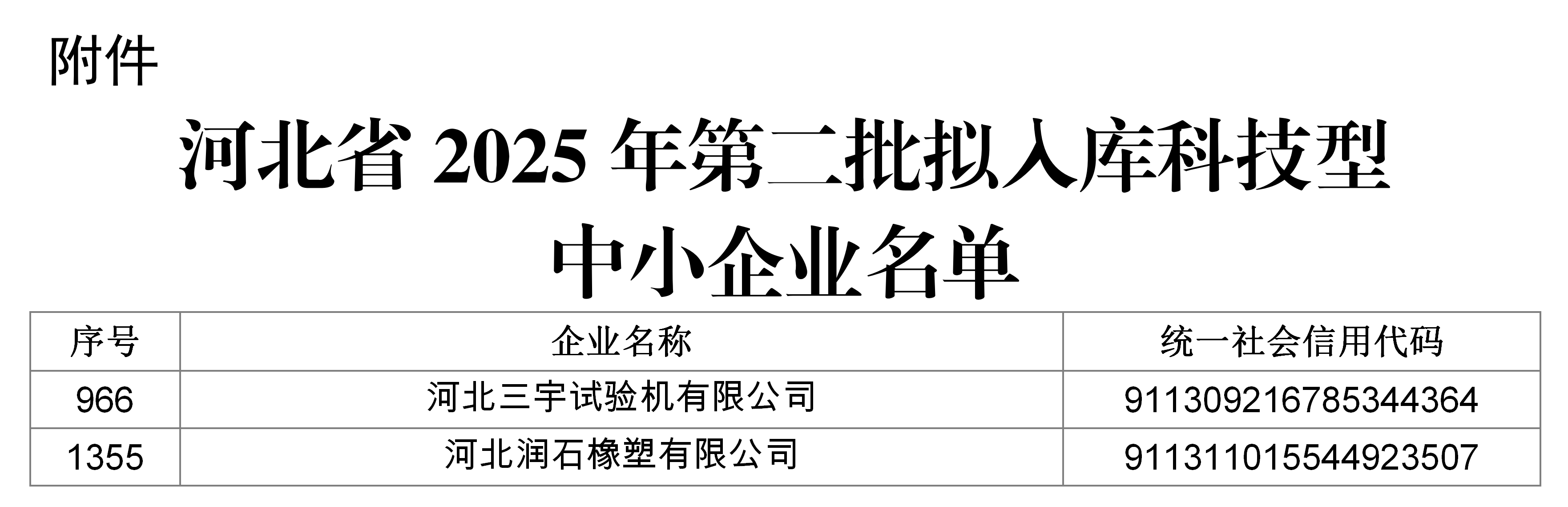 近日,河北省科学技术厅公示河北省2025年第二批拟入库科技型中小企业名单,协会会员单位河北三宇试验机有限公司、河北润石橡塑有限公司入选。