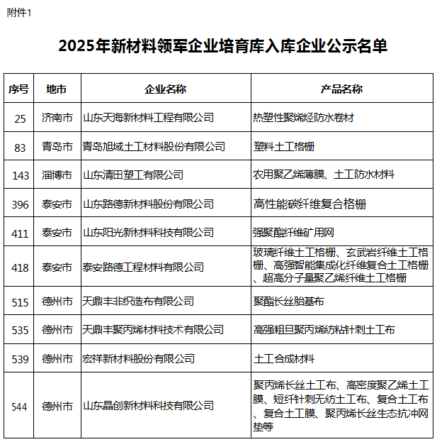 近日,山东省工业和信息化厅公示了2025年山东省新材料领军企业培育库入库企业及山东省新材料领军企业50强名单,协会常务理事单位青岛旭域土工材料股份有限公司、山东路德新材料股份有限公司、宏祥新材料股份有限公司;理事单位山东天海新材料工程有限公司、山东晶创新材料科技有限公司、天鼎丰控股有限公司(天鼎丰非织造布有限公司、天鼎丰聚丙烯材料技术有限公司);会员单位山东清田塑工有限公司、山东阳光新材料科技有限公司、泰安路德工程材料有限公司等多家单位入选。其中,山东路德新材料股份有限公司入选山东省新材料领军企业50强公示名单。
