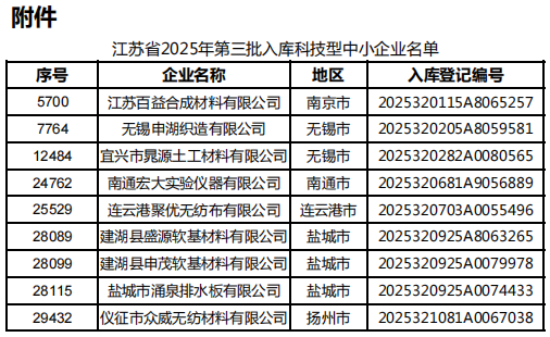 近日,江苏省科技厅公告江苏省2025年第三批入库科技型中小企业名单,协会会员单位江苏百益合成材料有限公司、无锡申湖织造有限公司、宜兴市晁源土工材料有限公司、南通宏大实验仪器有限公司、连云港聚优无纺布有限公司、建湖县盛源软基材料有限公司、建湖县申茂软基材料有限公司、盐城市涌泉排水板有限公司、仪征市众威无纺材料有限公司入选。