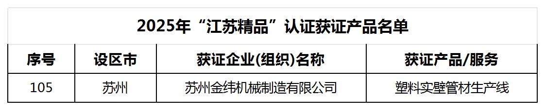 苏州金纬机械制造有限公司入选2025年“江苏精品”认证获证产品名单