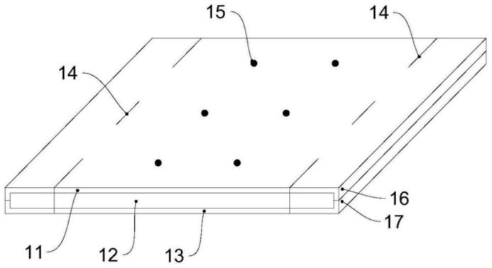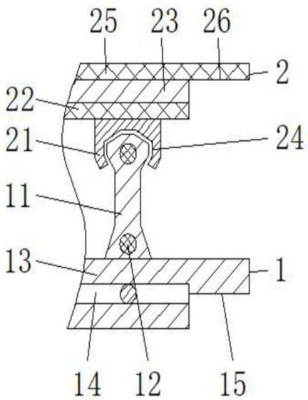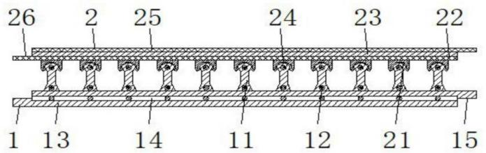 图2 图3 图1为本发明的底板半剖结构示意图; 图2为本发明的底板与浮板主剖视结构示意图; 图3为本发明的支撑键与嵌合键剖视放大结构示意图。 图例说明: 1、底板;11、支撑键;12、第一加强筋;13、地膜;14、第二加强筋;15、第一贴合槽;2、覆板;21、嵌合键;22、第一夹膜;23、无纺土工布;24、嵌合槽;25、第二夹膜;26、第二贴合槽。