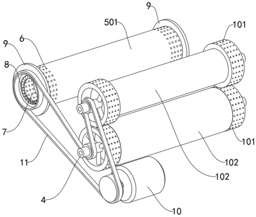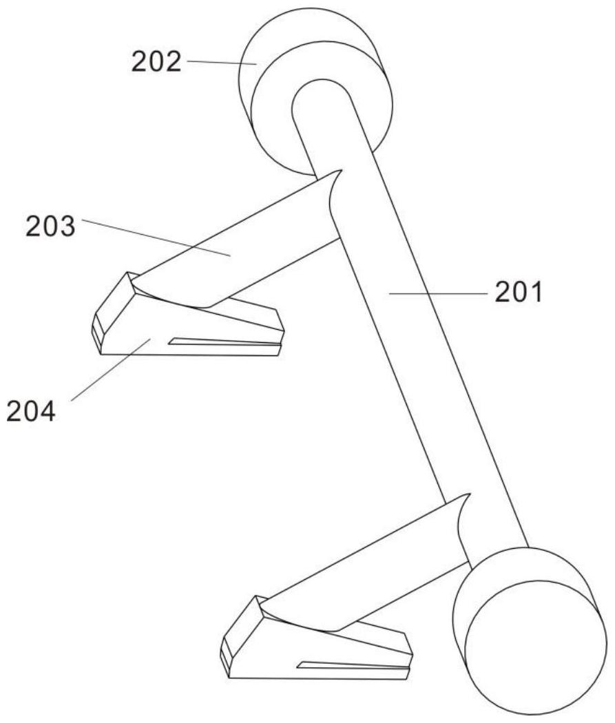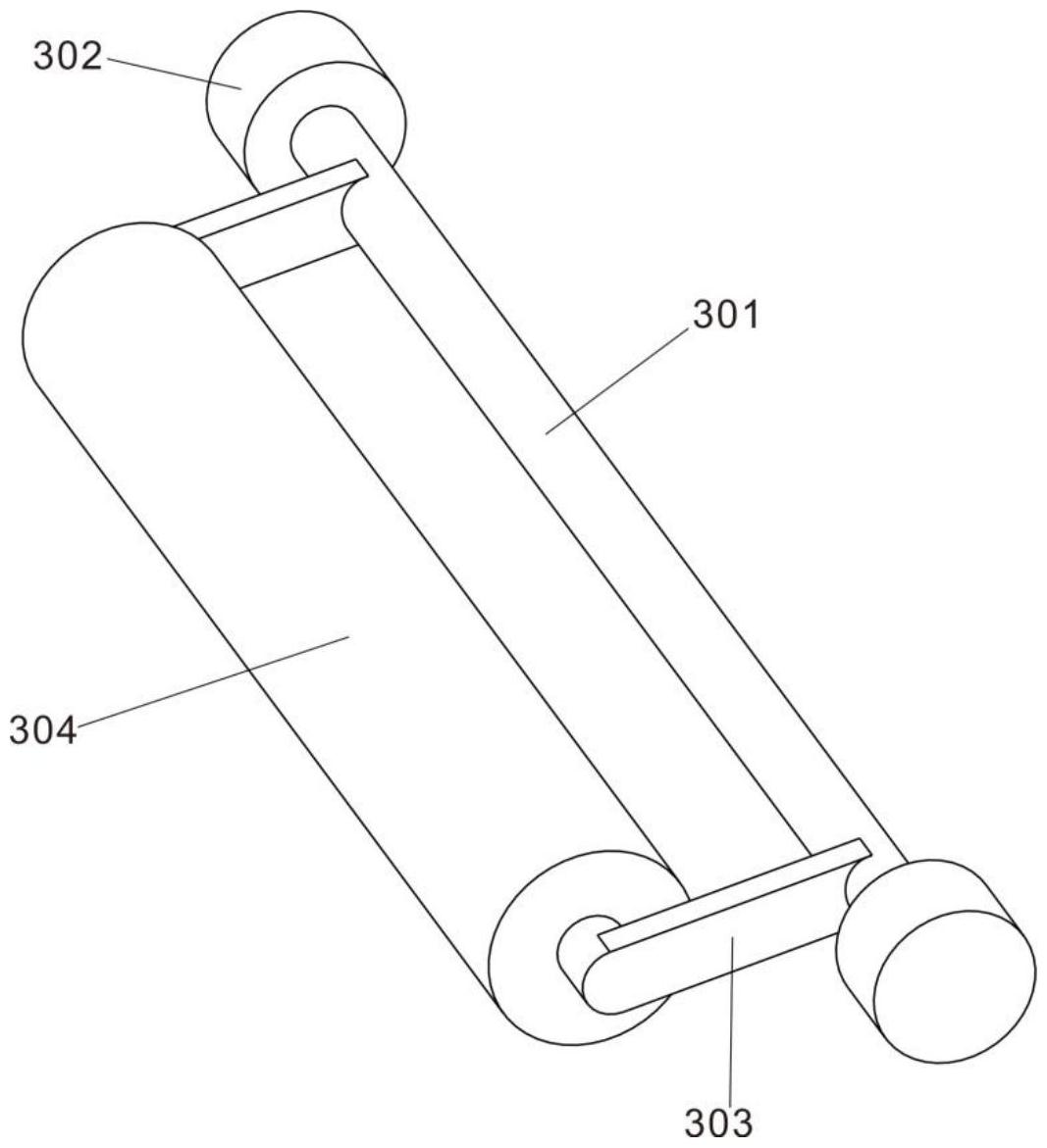 图2 图3 图4 图1为本实用新型的整体结构示意图; 图2为本实用新型中支撑架的的结构示意图; 图3为本实用新型中拖动件的结构示意图; 图4为本实用新型中压平件的结构示意图。 图例说明: 支撑架100、放置板101、支撑脚103、拖动件200、第一轴杆201、第一连杆203、卡夹204、滑轨102、第一滚轮202、压平件300、第二滚轮302、第二轴杆301、第二连杆303、压辊304、沟槽102a、角块102b、弧槽102c。 7.实用新型名称:一种土工布加工用去针装置 申请号:CN202421087815.3 公开号:CN222294514U 授权公告日:2025.01.03 专利权人:潍坊驼王实业有限公司 本实用新型公开了去针装置领域的一种土工布加工用去针装置,包括去针装置主体及位于其一端顶部与底部的电磁辊,去针装置主体靠近电磁辊一端表面两侧的顶部及底部均沿竖直方向滑动安装有固定块,同一水平面固定块相对面之间远离去针装置主体中部的一侧均沿水平方向滑动安装有第一移动板,第一移动板靠近去针装置主体的一端表面固定有第一锥形块,第二移动板靠近去针装置主体的一端表面固定有第二锥形块,在使用的过程中,有助于对电磁辊上吸附的针或是金属碎屑进行清理去除,避免针或是金属碎屑一直吸附在电磁辊上,以便于保证电磁辊对后续土工布上残留的针或是金属碎屑进行去除的效果,有助于对本去针装置进行使用。