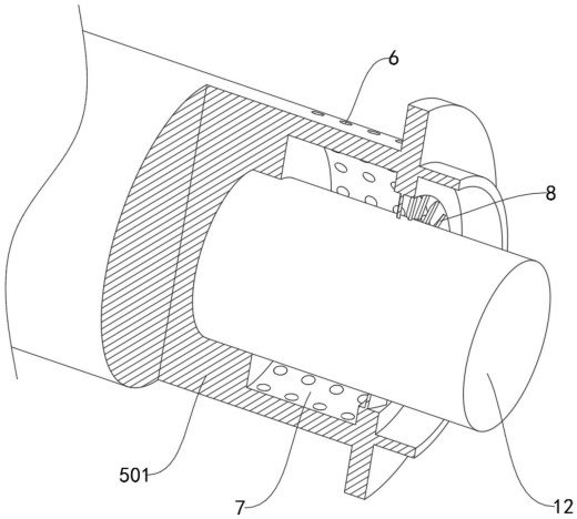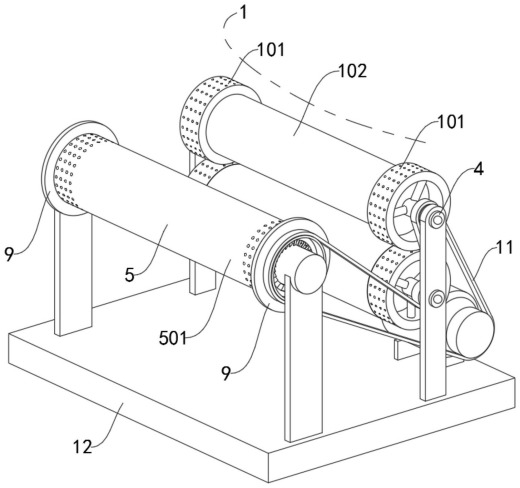 1.实用新型名称:一种土工布加工用压边机构 申请号:CN202420905732.4 公开号:CN222390075U 授权公告日:2025.01.24 专利权人:江苏百益合成材料有限公司 本实用新型涉及一种土工布加工用压边机构,包括:至少两个相对定点设置的压持部,所述压持部包括两个相对固定设置且同轴的转筒;构造在所述转筒内部的中空腔以及构造在转筒面部的出胶孔,所述出胶孔与中空腔相连通;与所述转筒同轴固设的固定管,其与所述中空腔相连通。本实用新型通过转筒与中空腔的配合,从而在两处转筒对布体进行压合过程中,胶料可以通过中空腔由出胶孔排出,从而在布体处于受压过程中渗入到布体,以更好的完成涂胶过程,从而提高压边质量,另外,本机构相比于现有技术来说,涂胶与压合均通过转筒配合完成,使得设备的结构更加简洁,制作成本更低。