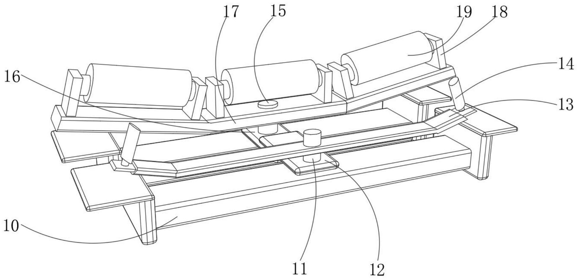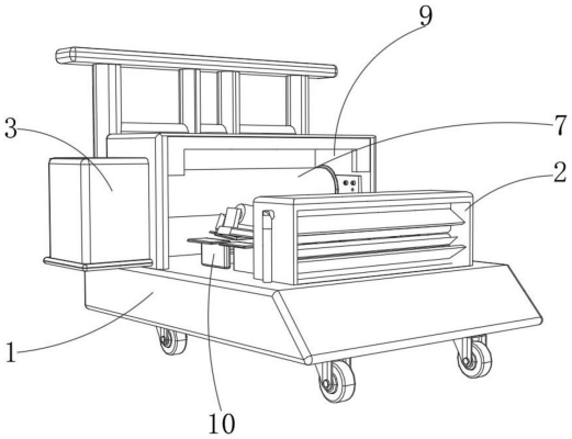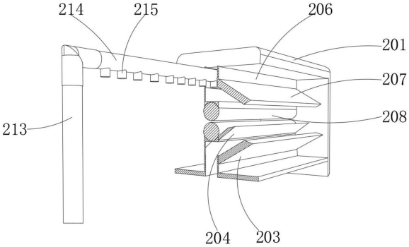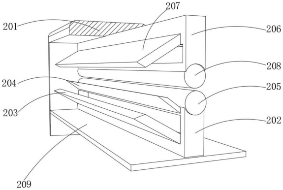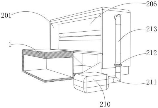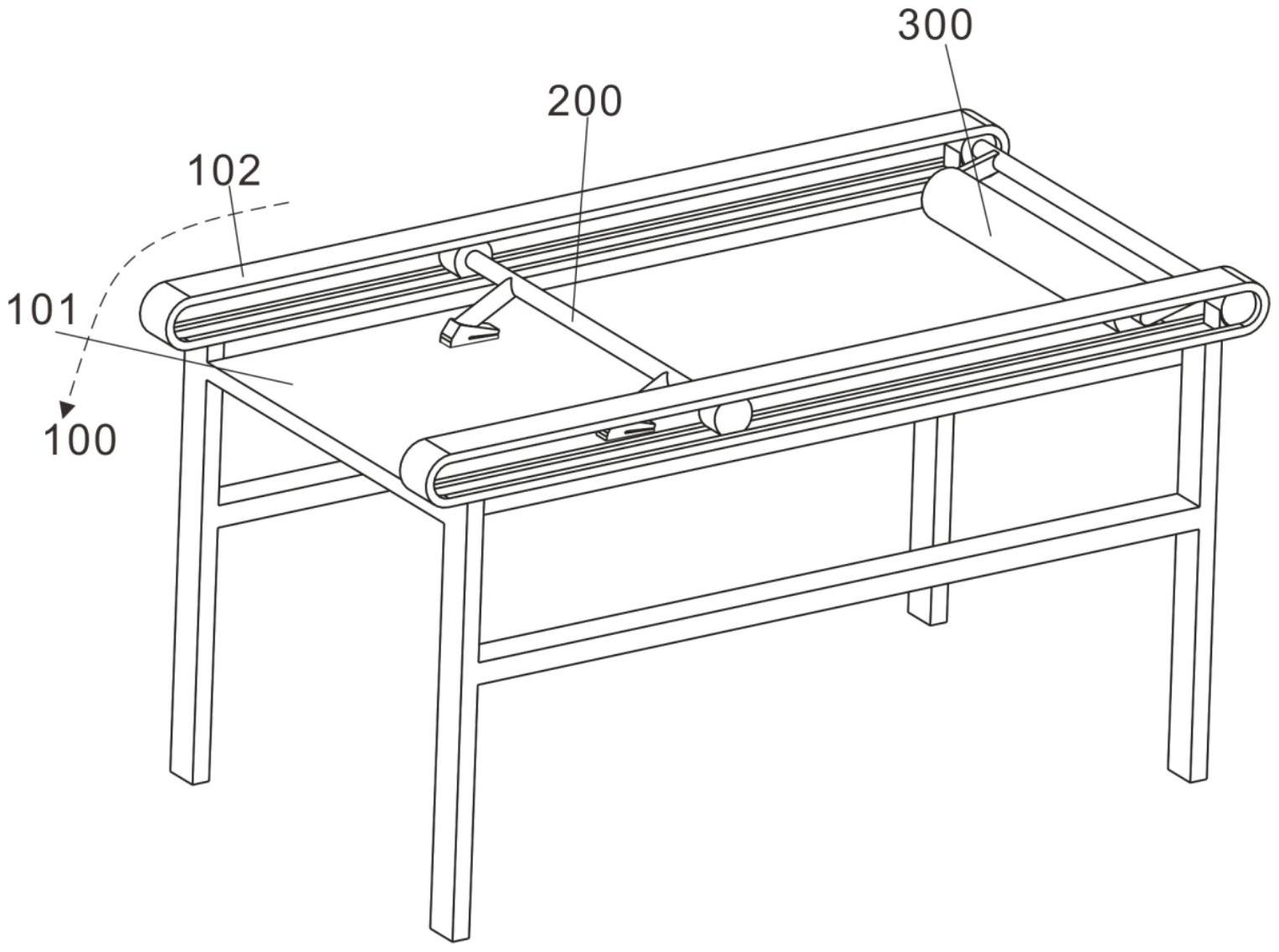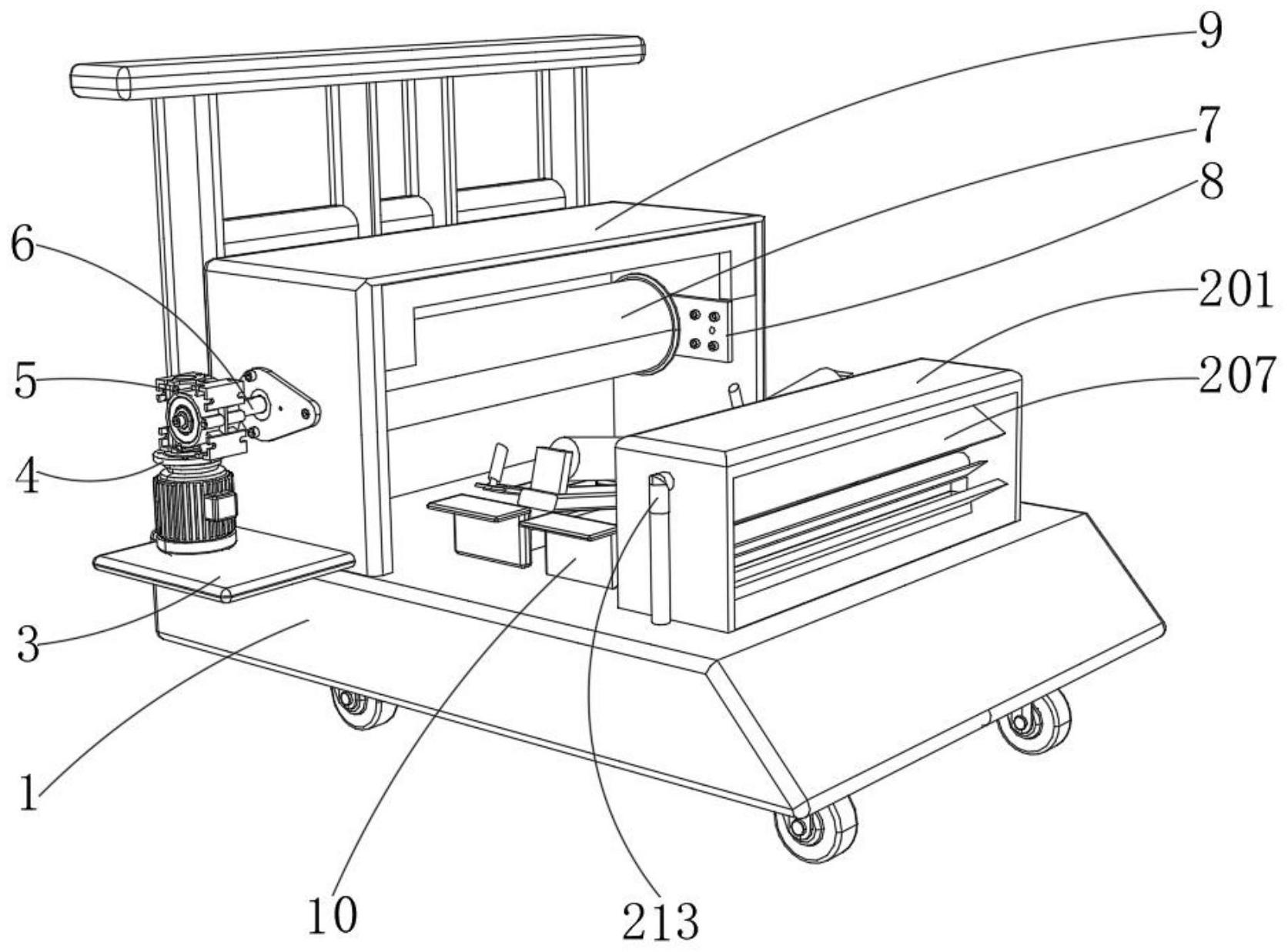 图2 图3 图4 图5 图6 图7 图1为本实用新型提出的一种土工布收放装置的立体结构图; 图2为本实用新型提出的一种土工布收放装置的操控箱内部结构图; 图3为本实用新型提出的一种土工布收放装置的清理机构结构图; 图4为本实用新型提出的一种土工布收放装置的清理机构内部剖视结构图; 图5为本实用新型提出的一种土工布收放装置的输送管结构图; 图6为本实用新型提出的一种土工布收放装置的导流板示意图; 图7为本实用新型提出的一种土工布收放装置的第一连接柱结构图。 图例说明: 1、底板;2、清理机构;201、支撑架;202、导流箱;203、斜板;204、刮片;205、第一旋转柱;206、风箱;207、风挡板;208、第二旋转柱;209、基板;210、气泵;211、连接管;212、电磁阀;213、输送管;214、通风管;215、喷头;216、导流板;3、操控箱;4、电机;5、连接器;6、连接轴;7、筒套;8、固定器;9、防护罩;10、底托板;11、第一连接柱;12、第一连接板;13、固定架;14、转动轴;15、第二连接柱;16、第二连接板;17、固定板;18、连接块;19、转筒。 6.实用新型名称:一种土工布生产的定长切割装置 申请号:CN202421019312.2 公开号:CN222294529U 授权公告日:2025.01.03 专利权人:江苏百益合成材料有限公司 本实用新型涉及一种土工布生产的定长切割装置,包括,支撑架,所述支撑架包括放置板和滑轨,所述滑轨设置于所述放置板两侧,所述滑轨上设置有计量刻度;拖动件,所述拖动件与滑轨连接,压平件,所述压平件设置于所述放置板上;本实用新型的土工布生产的定长切割装置通过压平见对土工布压平,避免褶皱对精度造成影响。