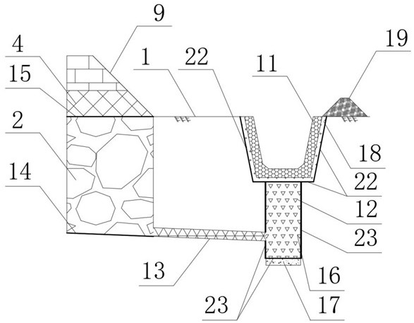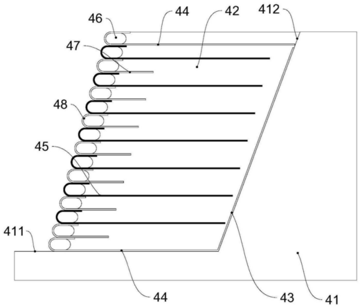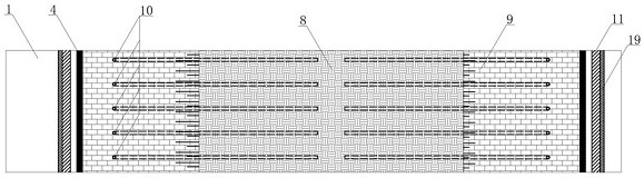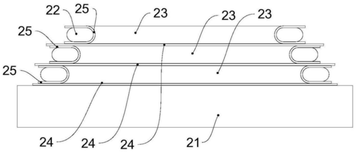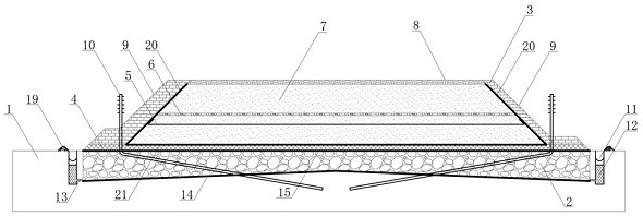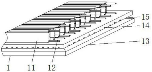 图2 图3 图4 图5 图6 图1是本发明复合土工织物实施例的结构图。 图2是本发明排水加固结构实施例一的结构图。 图3是本发明排水加固加固实施例二的结构图。 图4是本发明排水加固加固实施例三的结构图。 图5是本发明排水加固加固实施例四的结构图。 图6是本发明排水加固加固实施例五的结构图。 2.发明专利名称:一种复合土工布及其制备方法 申请号:CN202411406851.6 公开号:CN118906577B 授权公告日:2025.01.21 专利权人:南通学帆工程材料科技有限公司 本发明提供了一种复合土工布,自上而下依次包括第一保护层、加强层、布体基层、抗菌层和第二保护层;所述第一保护层、加强层、布体基层、抗菌层和第二保护层之间均通过粘胶紧密连接;所述第一保护层、加强层、布体基层、抗菌层和第二保护层的厚度比为1:0.8‑1.0:0.6‑0.9:1.3‑1.8:0.3‑0.6:1.2‑1.5。通过引入保护层、加强层、抗菌层,并将层与层之间胶接形成整体复合土工布,使其具有优异的抗拉强度、抗变形能力、抗菌等性能。 3.发明专利名称:复合防排水板 申请号:CN202110868519.1 公开号:CN113431027B 授权公告日:2025.01.10 专利权人:山东铁科聚合科技有限公司 本发明公开了复合防排水板,包括底板、覆板、支撑键、地膜、第二加强筋、第一贴合槽、嵌合键、第一夹膜和第二夹膜,所述复合防排水板由底板和覆板构成,所述底板由支撑键和地膜构成,所述覆板由嵌合键、第一夹膜、无纺土工布和第二夹膜构成;所述支撑键等距平行分布于地膜表面,且地膜内部嵌入安装有第二加强筋,所述支撑键内部嵌入插接有对称分布的第一加强筋;所述无纺土工布位于第一夹膜和第二夹膜之间,所述嵌合键等距分布于第一夹膜下表面。本发明通过分别设置第一加强筋和第二加强筋,有效提高了底板和支撑键的强度,并且设置嵌合键更加利于覆板与支撑键之间的精确连接。