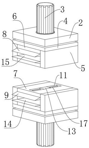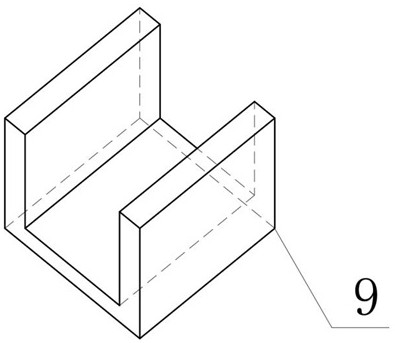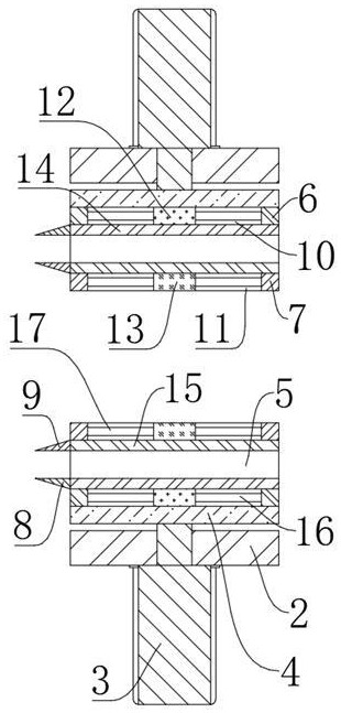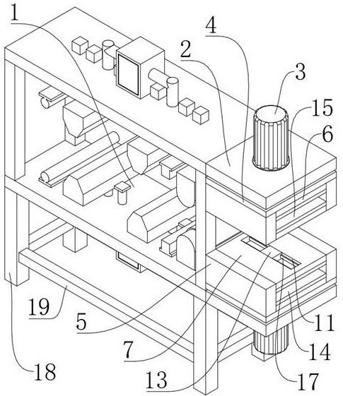 图2 图3 图4 图1为本实用新型的结构示意图; 图2为本实用新型的第二限位板结构示意图; 图3为本实用新型的第一移动板结构示意图; 图4为本实用新型的移动块结构示意图。 图例说明: 1、去针装置主体;2、固定板;3、液压缸;4、移动块;5、固定块;6、第一限位板;7、第二限位板;8、第一锥形块;9、第二锥形块;10、第一留置孔;11、第二留置孔;12、第一电动滑块;13、第二电动滑块;14、第一移动板;15、第二移动板;16、第一导轨;17、第二导轨;18、支撑腿;19、连接杆。