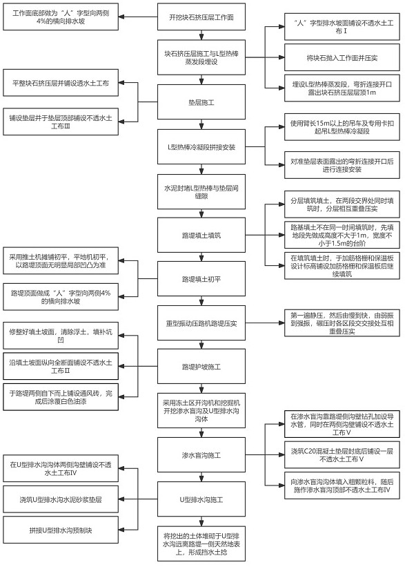 图2 图3 图4 图1为本实用新型的第一布体与第二布体组装示意图; 图2为本实用新型的第一布体与第二布体拆分示意图; 图3为本实用新型的滑扣连接机构结构示意图; 图4为本实用新型的双头轴杆与套管拆分示意图。 图例说明:第一布体1、第二布体2、滑扣连接机构3、第一连接组件31、第一底片311、孔块312、凸块313、第二连接组件32、第二底片321、连接杆322、L型插杆323、双头轴杆324、套管325、T型卡杆326、第一双面胶条4、第二双面胶条5。 4.实用新型名称:一种削减路面不均匀沉降的多年冻土路基降温结构 申请号:CN202421152266.3 公开号:CN222332388U 授权公告日:2025.01.10 专利权人:华南理工大学 本实用新型涉及一种削减路面不均匀沉降的多年冻土路基降温结构,该结构包括置于天然地基内的块石挤压层、置于块石挤压层上的路堤以及设在路堤上的通风砖、多个L型热棒、U型排水沟和渗水盲沟。天然地基为多年冻土区公路地基;块石挤压层的底部为横向排水坡,横向排水坡铺设不透水土工布Ⅰ、导水管;路堤由垫层、填土、沥青路面依次从下到上铺设构成;垫层铺设不透水土工布Ⅲ、透水土工布;填土的坡面铺设不透水土工布Ⅱ;填土中铺设加筋格栅和保温板;多个L型热棒安插于路堤两侧坡脚;路基的两侧各设一条U型排水沟和渗水盲沟。本实用新型有效解决在多年冻土区因路基吸热导致的下方多年冻土退化问题和因路基不均匀变形导致的路面纵向开裂问题。