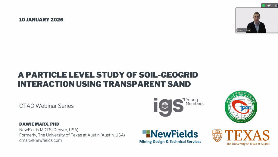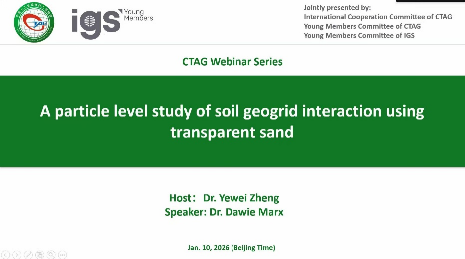 | 为进一步加强中国土工合成材料工程协会(CTAG)与国际土工合成材料学会(IGS)之间的交流与合作,促进青年学者的学术互动,CTAG国际合作工作委员会、CTAG青年工作委员会与IGS青年工作委员会于2026年1月10日联合举办了“CTAG YMC Webinar”网络学术研讨会,会议吸引了来自多所高校和科研机构的70余名青年学者积极参与。 本次会议由CTAG国际合作工作委员会秘书长郑烨炜教授主持,特邀IGS理事Dawie Marx博士作专题学术报告,报告题目为“A particle-level study of soil-geogrid interaction using transparent sand(使用透明砂进行土工格栅与土体相互作用的颗粒层面研究)”。在报告中,Dawie Marx博士系统介绍了透明土技术及其在筋土相互作用可视化研究中的应用,重点展示了拉拔过程中筋土界面的荷载传递机制,并对不同类型土工格栅在拉拔过程中表现出的变形模式与受力特征进行了对比分析,深化了对加筋机理的认识。在交流互动环节,与会人员围绕试验方法、机理解释等问题展开了深入讨论,学术氛围浓厚,交流效果良好。 本次网络学术研讨会为青年学者搭建了国际学术交流平台,进一步加强了CTAG与IGS之间的沟通与协作,对推动土工合成材料及相关岩土工程领域的研究与工程实践具有积极意义。