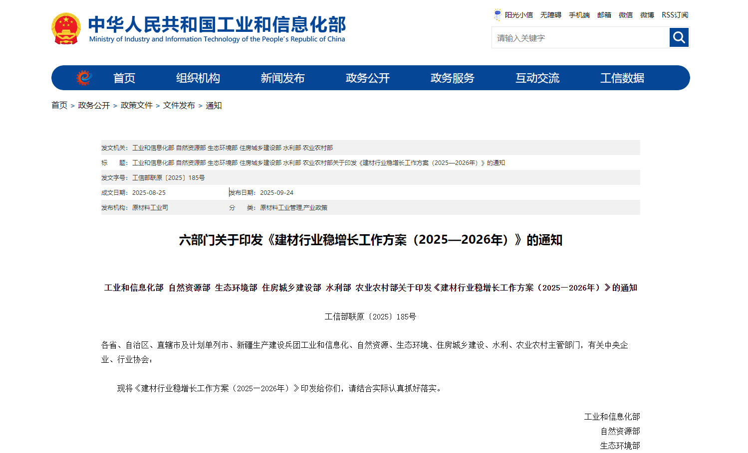 近日,工业和信息化部联合自然资源部、生态环境部、住房城乡建设部、水利部、农业农村部等六部门,印发了《建材行业稳增长工作方案(2025—2026年)》,以贯彻落实中央经济工作会议精神,推动行业平稳运行和高质量发展。